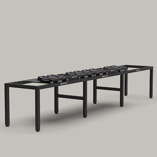 The Blacktable Slide Motion System is designed to keep the DJ artist's position consistently centered on stage. The sliding mechanism allows a first setup to be smoothly shifted into the central position, while a second setup can be prepared off-center and kept ready.